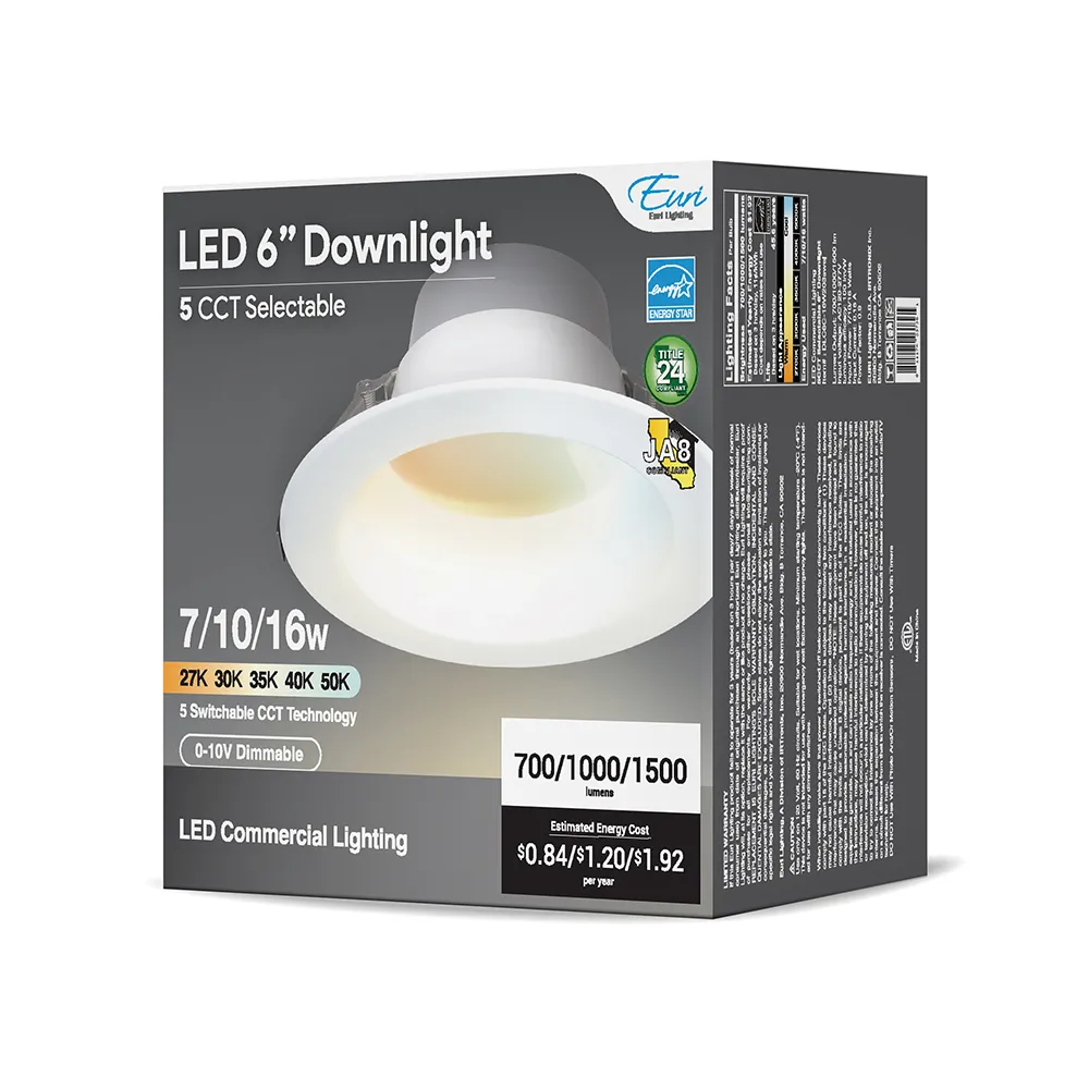 Commercial LED CA Compliant 6” Commercial Recessed Downlight 5 Color and 3 Wattage Selectable 0-10V Dimmable
