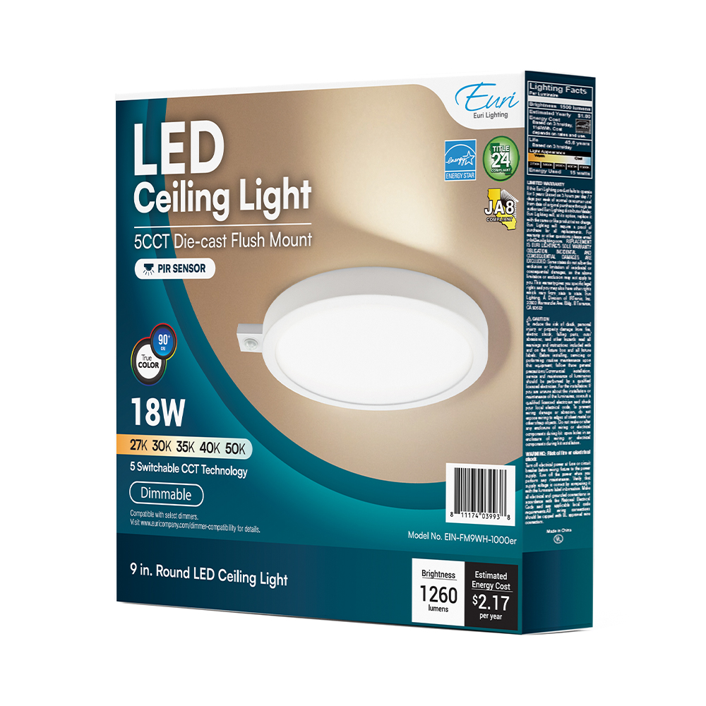 Residential LED Flush Mount CA Compliant 18-Watt 9” Flat Round Ceiling Light 5 Color Selectable Dimmable PIR Sensor